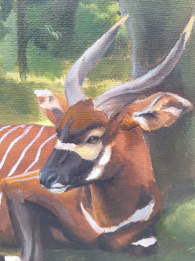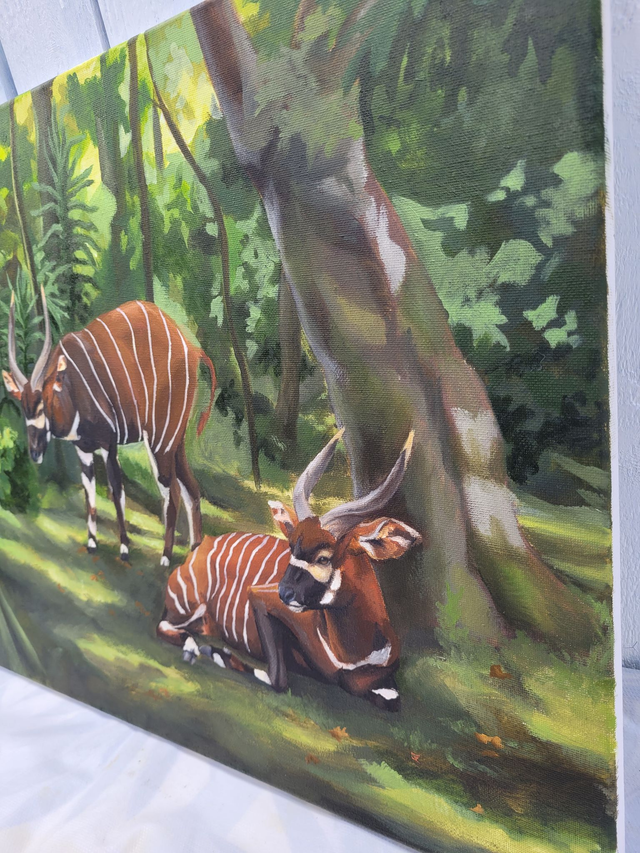 A solitary pair of Bongo antelopes rest in a forest clearing—calmly present despite the absence of their herd. Their stillness both serene and a quietly uneasy, a reflection on their threatened status and isolation in the wild.