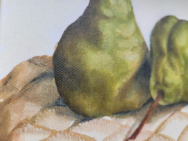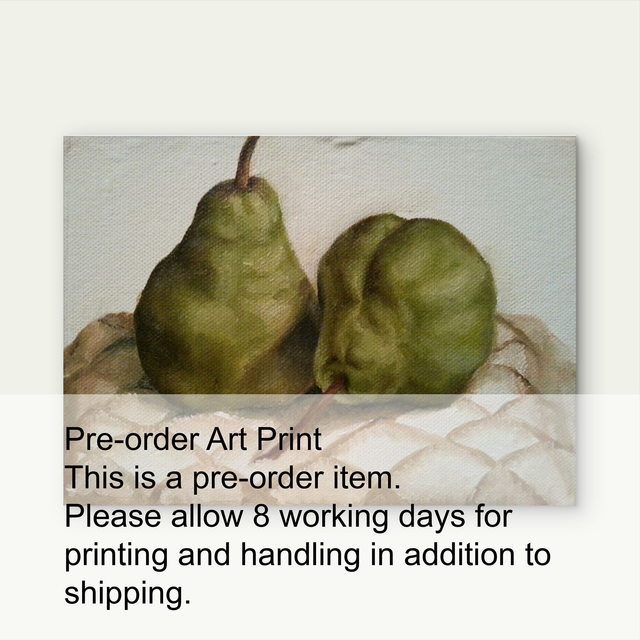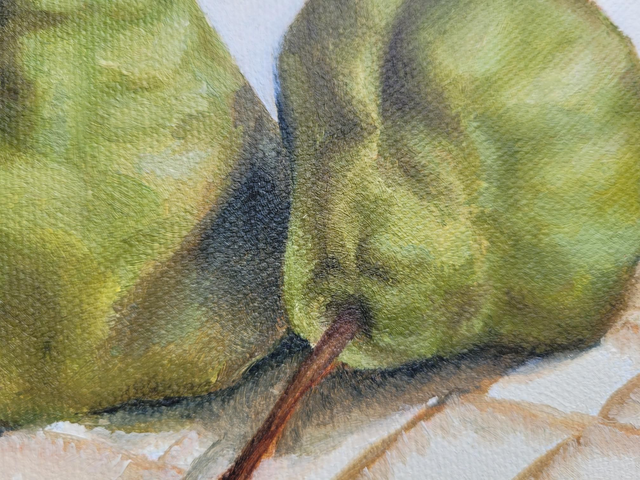 Two green pears on a checkered surface. 18 x 12.5 cm Oil on canvas board