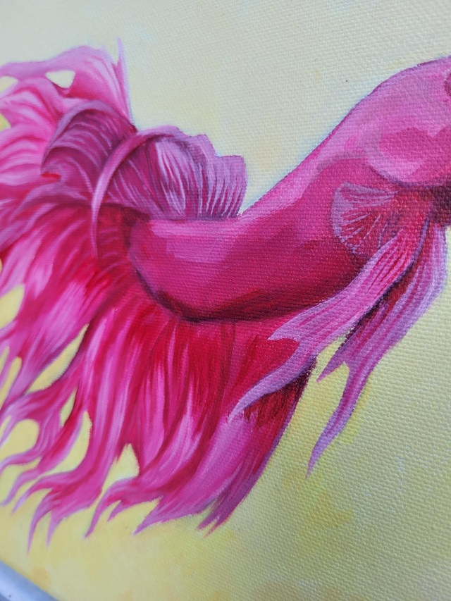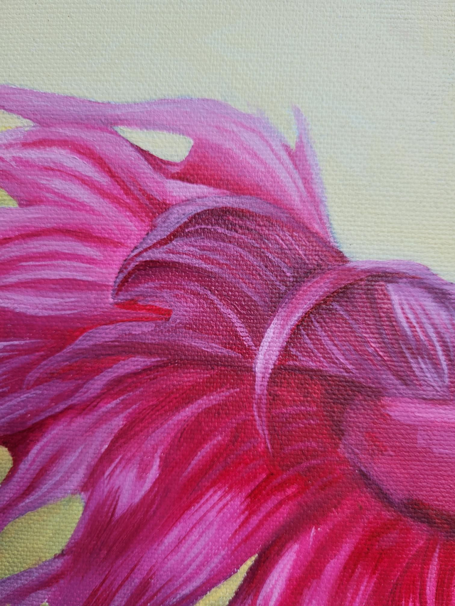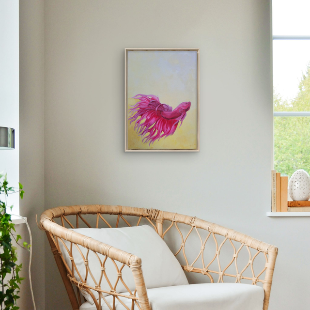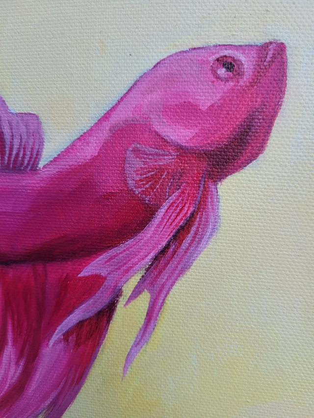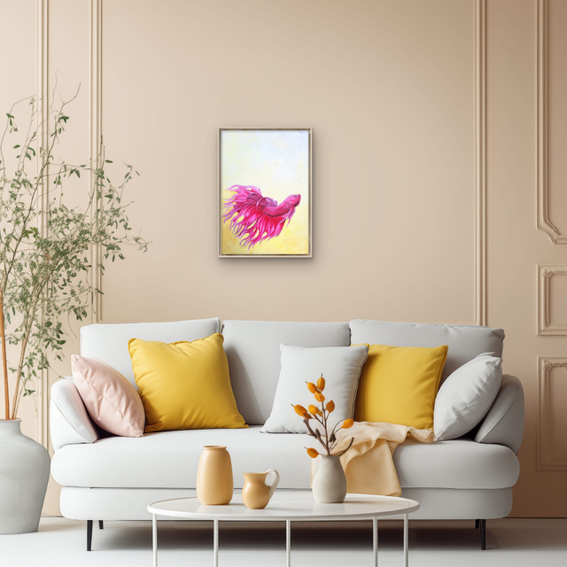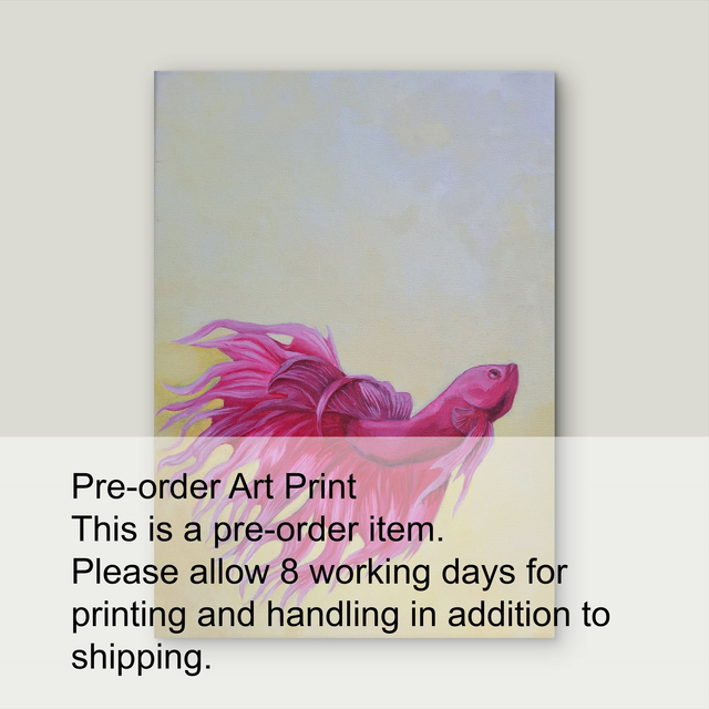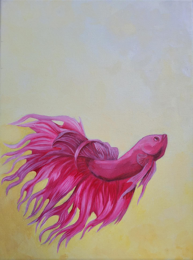 Playful bright pink fish, fins a-flow, on a light yellow background.